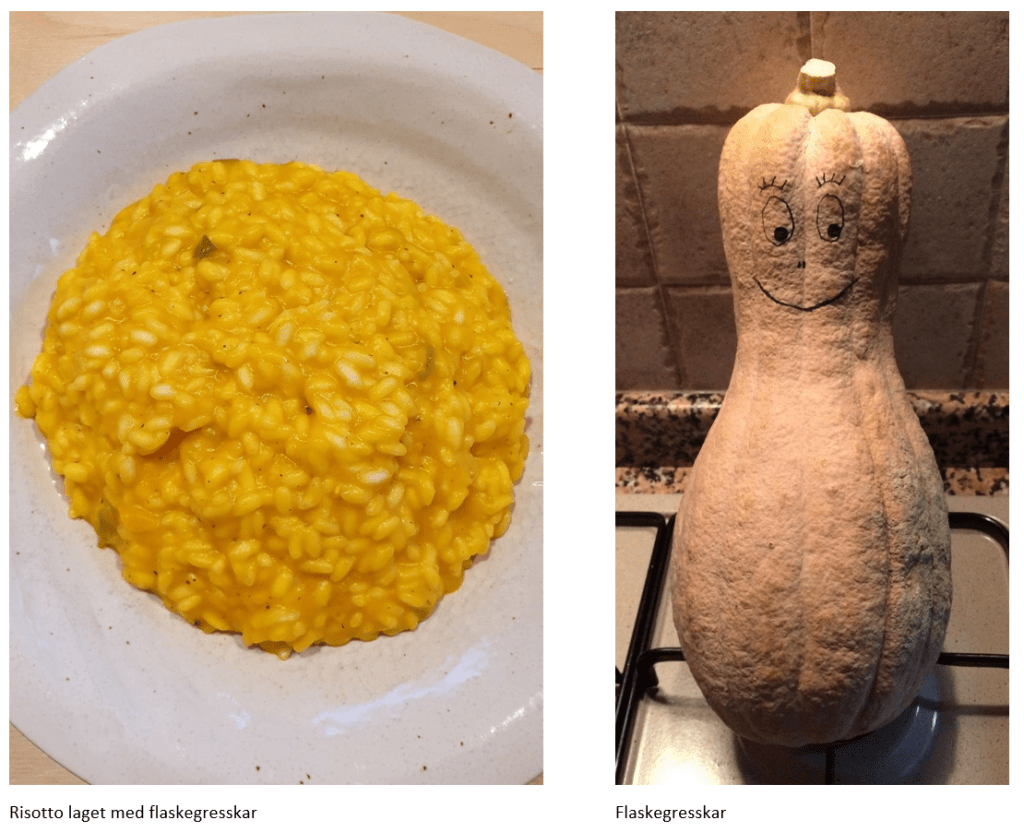 Det finnes veldig mange forskjellige typer gresskar. Disse har forskjellig konsistens, farge og smak, og de vil dermed gi forskjellig smak på risottoen. Jeg vil anbefale flaskegresskar (=butternut squash) eller spaghettigresskar, men man kan også bruke «halloween-gresskar». Flaskegresskar gir fargen og konsistensen som du ser på bildet nedenfor.