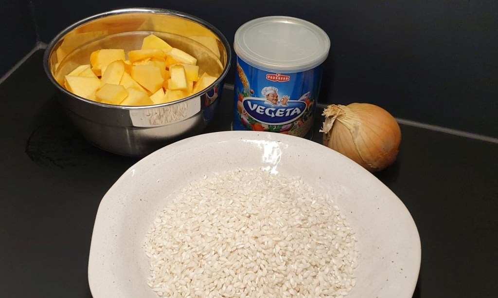 Tilsett de (nesten ferdig) kokte gresskarbitene sammen med risen, og rør godt. Du kan gjerne mose (=mash) gresskarbitene med en skje eller gaffel mens risottoen koker.