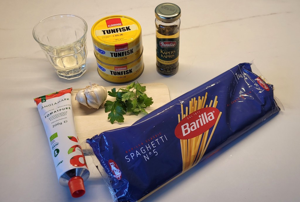Ønsker du en tynnere konsistens på tunfisksausen, kan du tilsette et par spiseskjeer av pastavannet. Smak til med salt og pepper.