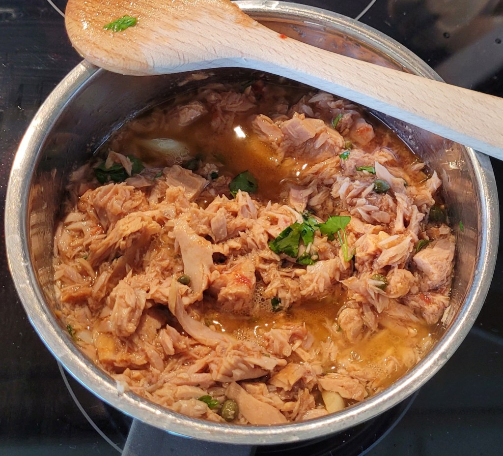 Knus tunfisken i mindre biter, og tilsett tomatpuréen sammen med hvitvinen.